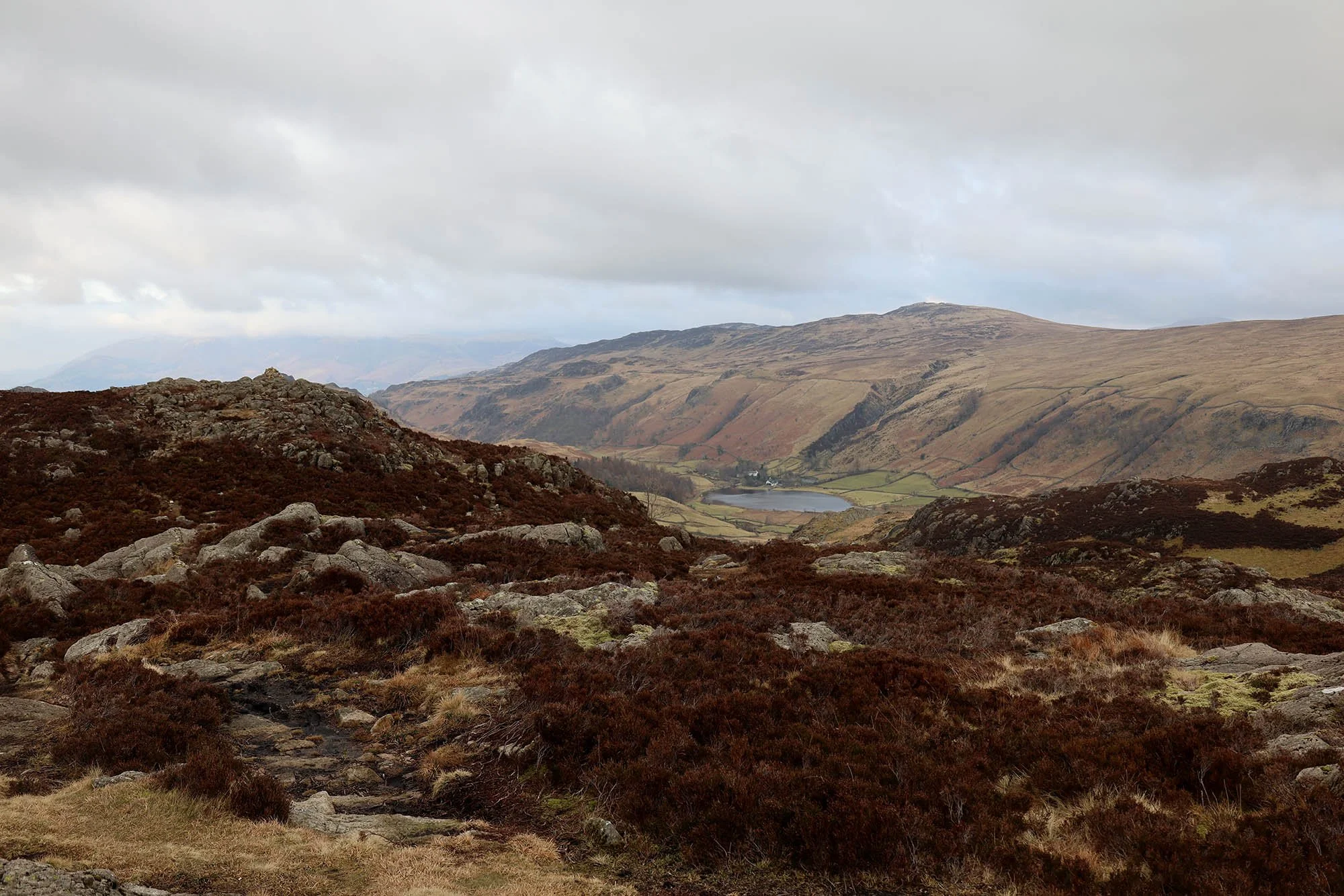The view to Rosthwaite Fell and down to Borrowdale - a dusting of snow on the higher peaks.