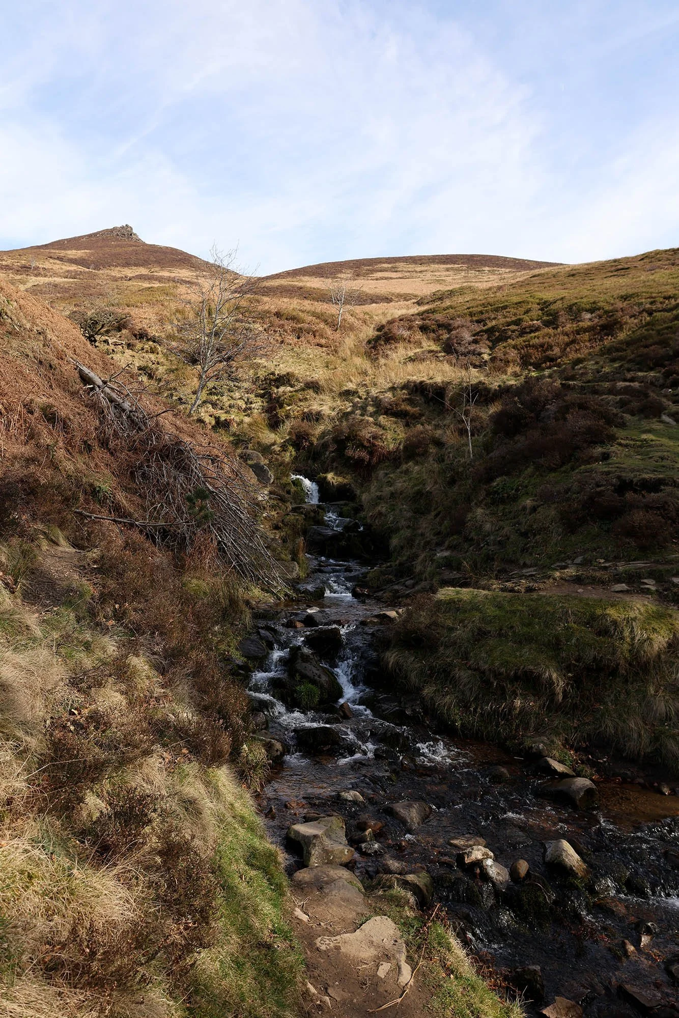 Crossing a stream and looking up to a pointed peak which I think could be Ringing Roger?